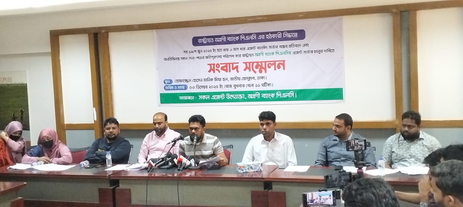 রাষ্ট্রীয় অগ্রণী ব্যাংক পিএলসি এর হঠকারী সিদ্ধান্তে গত ১৯ শে জুন ২০২৫ ইং হতে ৬ মাস ধরে এজেন্ট ব্যাংকিং সার্ভার বন্ধের প্রতিবাদে এবং অনতিবিলম্বে সকল দেনা পাওনা ক্ষতিপূরণসহ পরিশোধ করে রাষ্ট্রীয় অগ্রণী এর এজেন্ট সার্ভার চালুর দাবিতে আজ ০৩-১২-২০২৫ ইং বুধবার সকাল ১১:০০ ঘটিকায় তফাজ্জল হোসেন মানিক মিয়া হল, জাতীয় প্রেস ক্লাবে দীর্ঘ দিনের বকেয়া বিল প্রদান ও এজেন্ট সার্ভার চালুর দাবিতে এক “সংবাদ সম্মেলন” আয়োজন করে অগ্রণী ব্যাংকের সকল এজেন্ট উদ্যোক্তা।