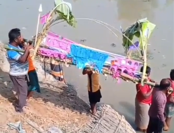 কাহারোলে ভবানীপুর কলার ভেলায় মৃতদেহ নিয়ে শ্মশান যাত্রা।