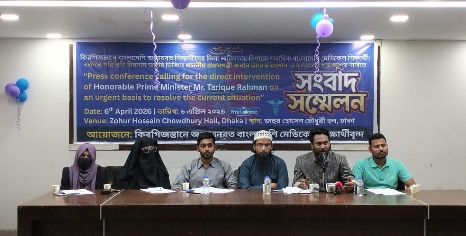 মো: সাইফুল আলম সরকার, ঢাকা: কিরগিজস্তানে অধ্যয়নরত ১৫০-এরও বেশি বাংলাদেশি মেডিকেল শিক্ষার্থী গত জুলাই ২০২৫ থেকে ভিসা জটিলতার কারণে বাংলাদেশে আটকে আছেন। কিরগিজ ভিসা পোর্টালে স্টুডেন্ট ভিসা ক্যাটাগরি "উন্মুক্ত" দেখালেও সুনির্দিষ্ট কোনো কারণ উল্লেখ্য ছাড়াই বাংলাদেশি শিক্ষার্থীদের আবেদন অনুমোদন করা হচ্ছে না। কিরগিজ সরকার কোনো অগ্রিম সতর্ক বার্তা ছাড়াই আমাদের ভিসা প্রদান করা বন্ধ রেখেছে। এই পরিস্থিতিতে শিক্ষার্থীরা একটি পূর্ণ সেমিস্টার হারিয়েছেন এবং বিশ্ববিদ্যালয় থেকে বহিষ্কারের হুমকির মুখে পড়েছেন। এই বিষয়ে আজ ৬ই এপ্রিল জাতীয় প্রেসক্লাবে এক সংবাদ সম্মেলন করেন কিরগিজস্তানে ভুক্তভোগী মেডিকেল শিক্ষার্থীরা।