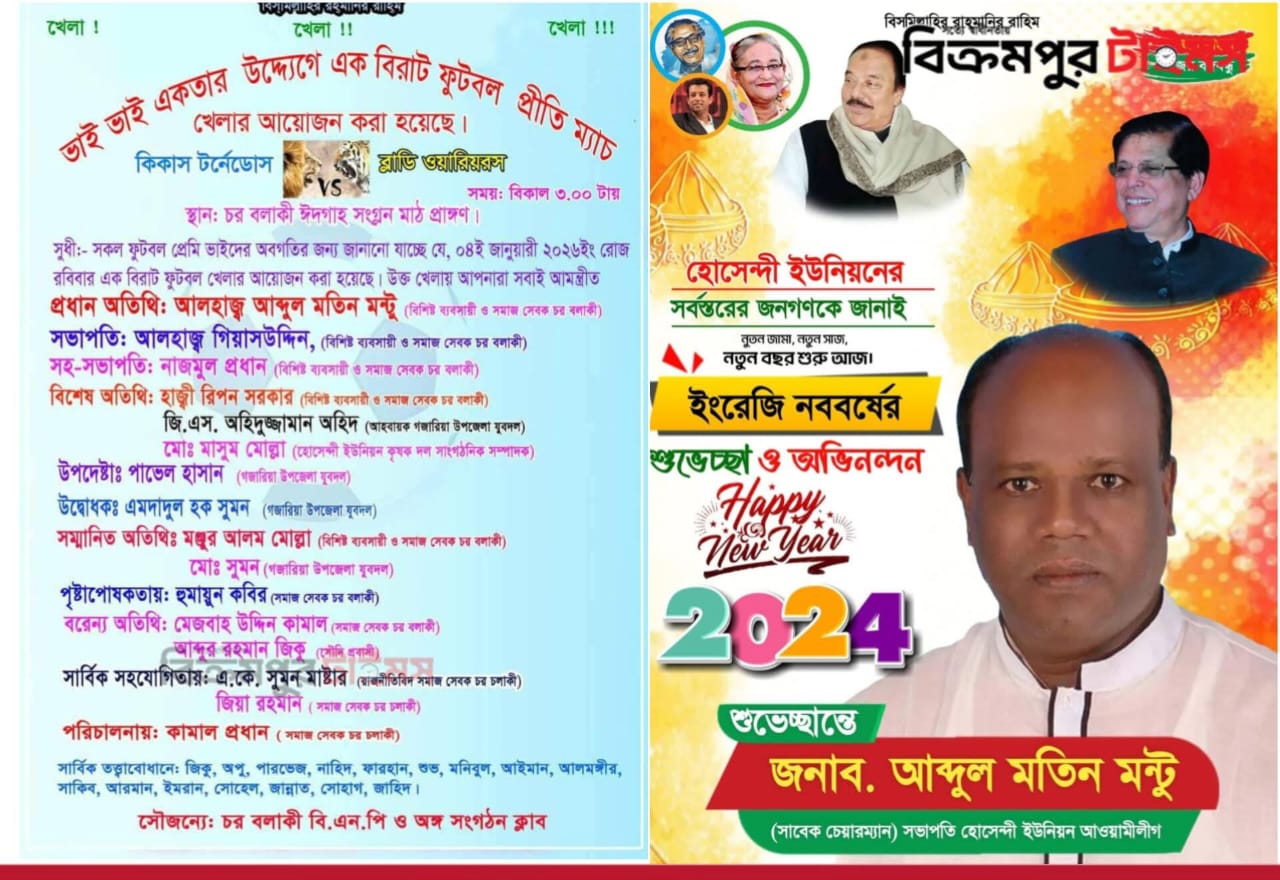 বিএনপির আয়োজনে ফুটবল ম্যাচ, আর সেখানে প্রধান অতিথি ইউনিয়ন আওয়ালীগের সভাপতি! শুনতে অবাক লাগলেও এঘটনা মুন্সিগঞ্জের গজারিয়া উপজেলার হোসেন্দী ইউনিয়নে। ইউনিয়নটিতে চরবলাকী বিএনপি ও অঙ্গসংগঠনের ব্যানারে অনুষ্ঠিত হতে যাওয়া একটি ফুটবল ম্যাচে প্রধান অতিথি করা হয়েছে আব্দুল মতিন মিন্টুকে। তিনি হোসেন্দী ইউনিয়ন আওয়ামী লীগের সভাপতি। আয়োজনের পোষ্টার সামাজিক মাধ্যমে ছড়িয়ে পড়লে এলাকায় তীব্র সমালোচনা শুরু হয়েছে।