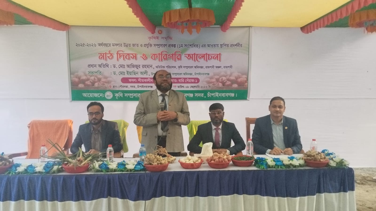 অনুষ্ঠানে সভাপতিত্ব করেন কৃষি সম্প্রসারণ অধিদপ্তর, চাঁপাইনবাবগঞ্জের উপ-পরিচালক ড. মোঃ ইয়াছিন আলী। প্রধান অতিথি হিসেবে বক্তব্য রাখেন রাজশাহী অঞ্চলের কৃষি দপ্তরের অতিরিক্ত পরিচালক ড. মোঃ আজিজুর রহমান। তিনি বলেন, “মসলার উন্নত জাত ও আধুনিক প্রযুক্তি ব্যবহার করলে উৎপাদন বৃদ্ধি পাবে এবং কৃষকরা আর্থিকভাবে লাভবান হবেন।”শুভেচ্ছা বক্তব্য রাখেন সদর উপজেলা কৃষি কর্মকর্তা মোঃ সুনাইন বিন জামান। এছাড়া কারিগরি আলোচনা সভায় বক্তব্য রাখেন সদর উপজেলা কৃষি সম্প্রসারণ কর্মকর্তা ও অংশগ্রহণকারী কৃষক নাসিরুল ইসলাম। মাঠ দিবস ও আলোচনা সভায় প্রায় ১৫০ জন কৃষক ও কৃষাণী অংশগ্রহণ করেন। তারা উন্নত জাতের মসলার চাষাবাদ পদ্ধতি সম্পর্কে বাস্তব অভিজ্ঞতা অর্জন করেন এবং ভবিষ্যতে এসব প্রযুক্তি ব্যবহারে আগ্রহ প্রকাশ করেন
