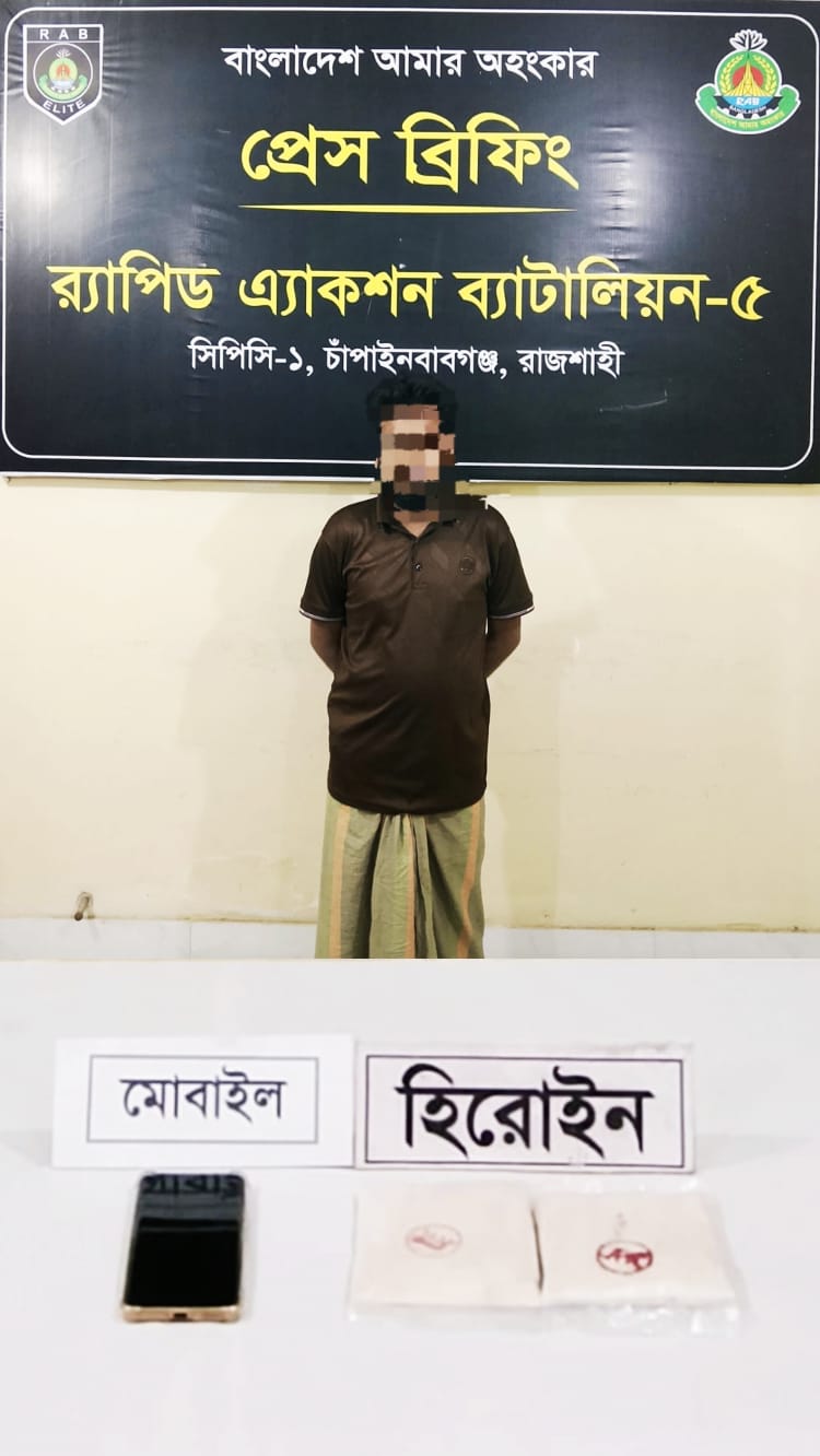 চাঁপাইনবাবগঞ্জে র‌্যাব-৫ অভিযানে ২০০ গ্রাম হেরোইনসহ মাদক কারবারি গ্রেফতার।