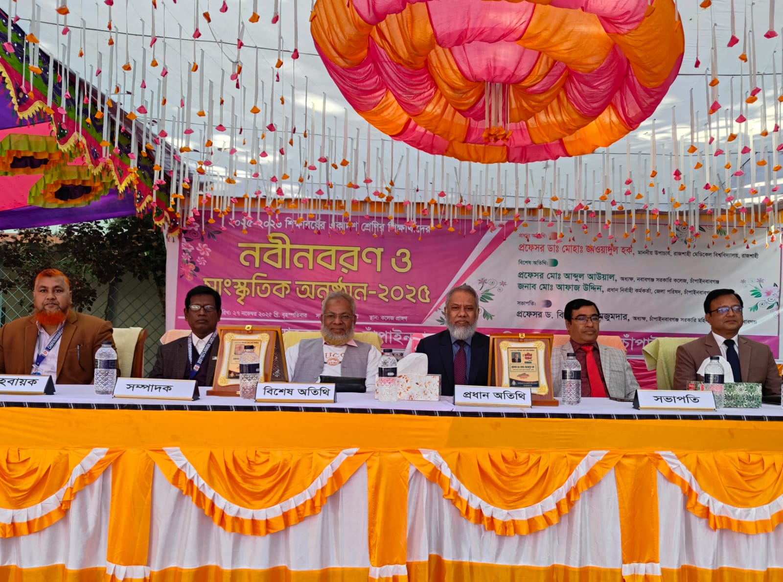 চাঁপাইনবাবগঞ্জ সরকারি মহিলা কলেজে ২০২৫-২৬ শিক্ষাবর্ষের একাদশ শ্রেণির শিক্ষার্থীদের নবীনবরণ ও সাংস্কৃতিক অনুষ্ঠান আয়োজন করা হয়েছে। (২৭ নভেম্বর) বৃহস্পতিবার সকাল ১০ ঘটিকায় অত্র কলেজে মাঠ প্রাঙ্গণে অনুষ্ঠিত হয়। উক্ত অনুষ্ঠানে সভাপতিত্ব করেন চাঁপাইনবাবগঞ্জ সরকারি মহিলা কলেজের অধ্যক্ষ প্রফেসর ড. বিপ্লব কুমার মজুমদার। স্বাগত বক্তব্য দেন,অত্র কলেজের বাংলা বিভাগের বিভাগী প্রধান ও আজকের অনুষ্ঠানের আহবায়ক মোঃ আনোয়ারুল ইসলাম। অনুষ্ঠানে প্রধান অতিথি হিসেবে ছিলেন, রাজশাহী মেডিকেল বিশ্ববিদ্যালয়ের মাননীয় উপাচার্য প্রফেসর ডাঃ মোহাঃ জাওয়াদুল হক। বিশেষ অতিথি হিসেবে ছিলেন, নবাবগঞ্জ সরকারি কলেজের অধ্যক্ষ প্রফেসর মোঃ আব্দুল আওয়াল, জেলা পরিষদের প্রধান নির্বাহী কর্মকর্তা জনাব মোঃ আফাজ উদ্দিন, চাঁপাইনবাবগঞ্জে পাবলিক প্রসিকিউটর এ্যাডভোকেট আবদুল ওদুদ, চাঁপাইনবাবগঞ্জ সরকারি মহিলা কলেজের অধ্যাপক ইসলামের ইতিহাস ও সংস্কৃতির প্রফেসর মুহাম্মদ ইনসান আলী, সিভিল সার্জনের সিনিয়র স্বাস্থ্য শিক্ষা কর্মকর্তা মোসাঃ শামশুন নাহার,রাজশাহী সিটি কলেজের রাস্ট্রবিজ্ঞানে সহকারী অধ্যাপক মোঃ তানভিরুল হক প্রমুখ।