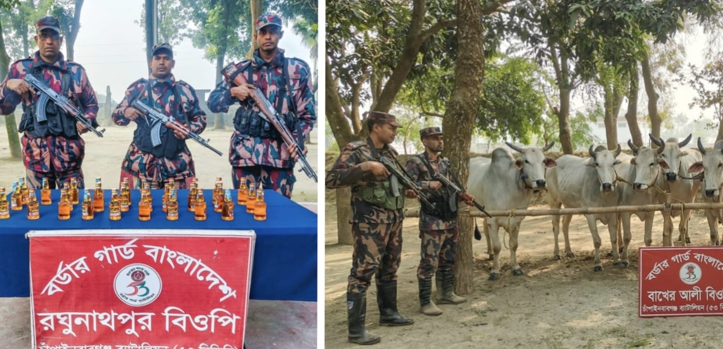 চাঁপাইনবাবগঞ্জ সীমান্তে ৫৩ বিজিবির পৃথক অভিযানে ভারতীয় মদ ও ১১ গরু জব্দ