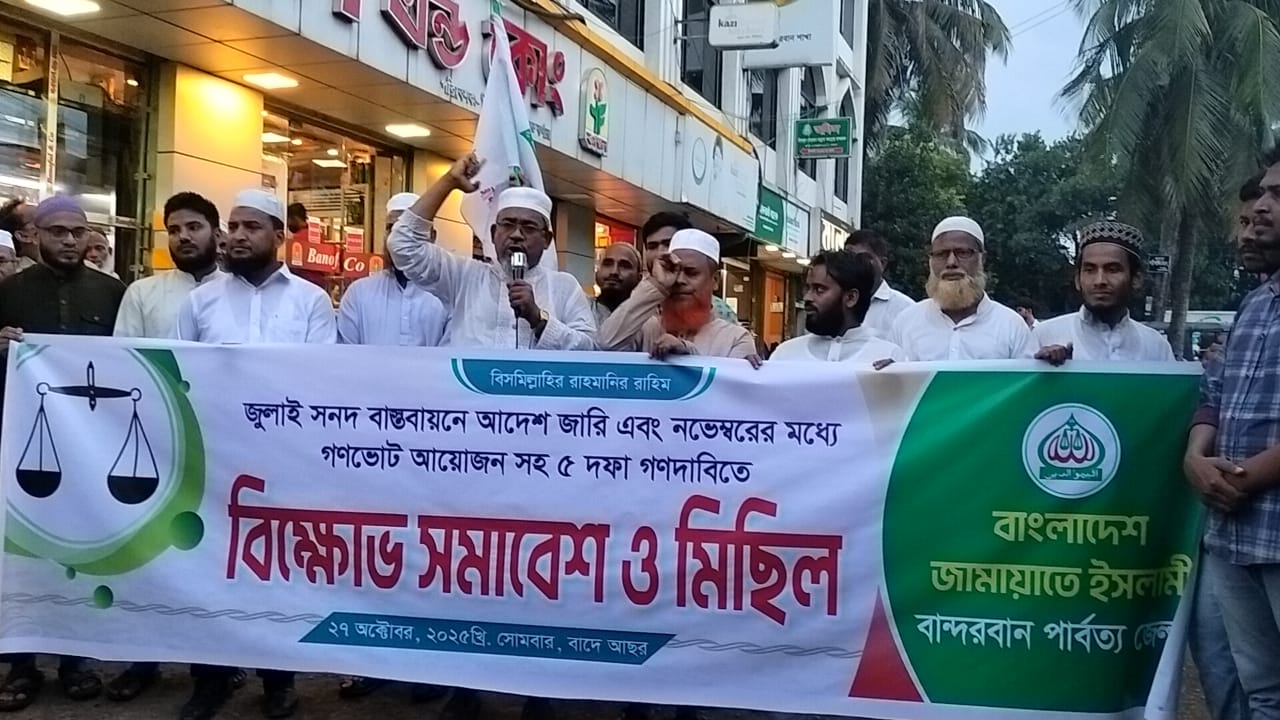 জুলাই সনদ বাস্তবায়নে আদেশ জারি এবং নভেম্বরের মধ্যে গণভোট আয়োজন’সহ ৫দফা গণদাবিতে বান্দরবানে বিক্ষোভ সমাবেশ ও মিছিল