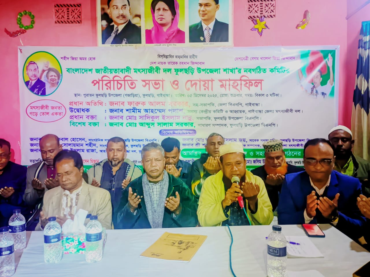 গাইবান্ধার ফুলছড়ি উপজেলায় ৫ ডিসেম্বর ২০২৫ ইং তারিখে মৎস্যজীবী দলের উদ্যোগে পরিচিতি সভা ও দেশনেত্রী বেগম খালেদা জিয়ার রোগমুক্তি কামনায় দোয়া মাহফিল অনুষ্ঠিত হয়েছে।