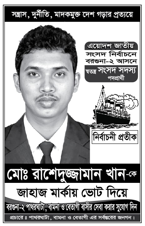 বরগুনা: এবছরের এয়োদশ জাতীয় সংসদ নির্বাচনে বরগুনা-২ আসনের জন্য স্বতন্ত্র সংসদ সদস্য পদপ্রার্থী মোঃ রাশেদুজ্জামান খান নির্বাচনী প্রতীক জাহাজ-এ ভোটের মাধ্যমে জনগণের সেবা করার আহ্বান জানিয়েছেন।