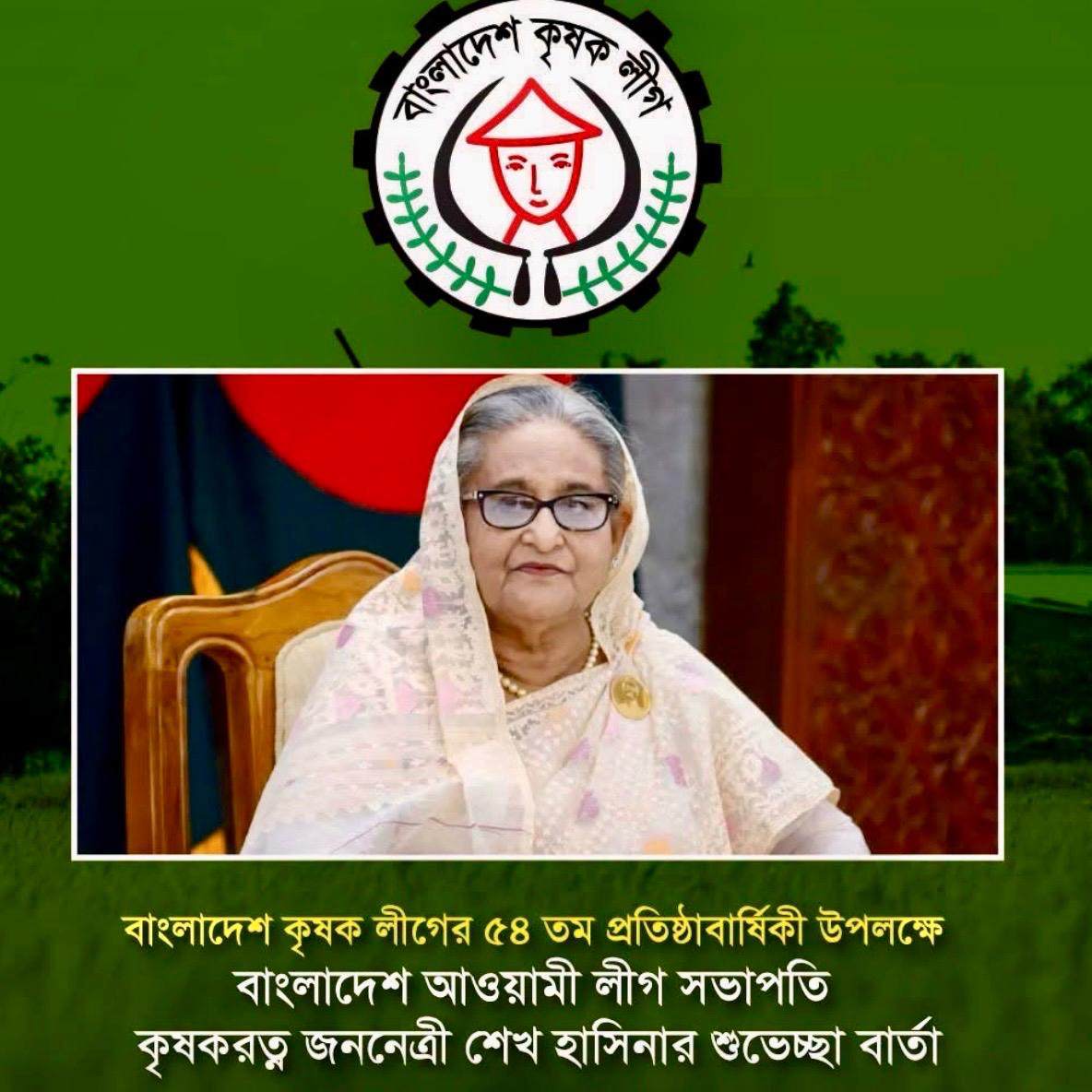 বাংলাদেশ কৃষক লীগের ৫৪তম প্রতিষ্ঠাবার্ষিকী উপলক্ষে বাংলাদেশ আওয়ামী লীগ সভাপতি শেখ হাসিনার শুভেচ্ছা বার্তা