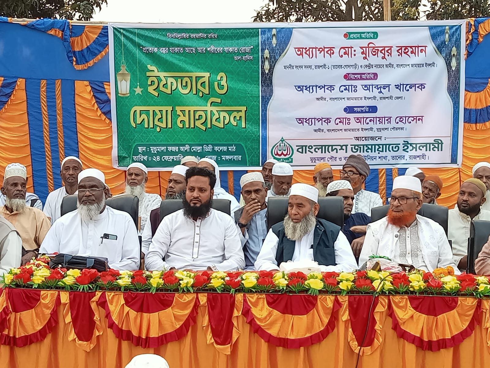 রাজশাহী জেলাধীন তানোর উপজেলার মুন্ডুমালা পৌরসভা ও বাঁধাইড় ইউনিয়ন পরিষদের বাংলাদেশ জামায়াতে ইসলামীর শাখার আয়োজনে ইফতার ও দোয়া মাহফিল অনুষ্ঠিত হয়। আজ বিকেল পাঁচ ঘটিকার সময় মুন্ডুমালা ফজর আলী মোল্লা ডিগ্রি কলেজ মাঠে ইফতার ও দোয়া মাহফিল অনুষ্ঠিত হয়। উক্ত ইফতার ও দোয়া মাহফিলে পুরো কলেজ মাঠ বাংলাদেশ জামায়াতে ইসলামীর নেতা কর্মী ও সমর্থক দের উপস্থিতিতে কানায় কানায় পরিপূর্ণ হয়ে যায়। উপস্থিত সকল জনসাধারণের মাঝে উৎসাহ ও উদ্দীপনা লক্ষ করা যায়। উক্ত অনুষ্ঠানে প্রধান অতিথি হিসেবে উপস্থিত ছিলেন বাংলাদেশ জামায়াতে ইসলামীর কেন্দ্রীয় সিনিয়র নায়েব আমীর এবং রাজশাহী- ১ (তানোর- গোদাগাড়ী) আসনের বাংলাদেশ জামায়াতে ইসলামীর নব নির্বাচিত জাতীয় সংসদ সদস্য অধ্যাপক মজিবুর রহমান। অধ্যাপক মজিবুর রহমান উপস্থিত সকলের উদ্দেশ্যে দিক নির্দেশনা মূলক গুরুত্বপূর্ণ আলোচনা করেন এবং সকল কে ধৈর্যের সঙ্গে ও সততার সহিত দায়িত্ব পালন করার আহ্বান জানান। তিনি সম্প্রতি জাতীয় নির্বাচন নিয়েও কিছু যৌক্তিক আলোচনা করেন। অনুষ্ঠানে জামায়াতের অন্যান্য নেতা গনও গুরুত্বপূর্ণ নানা আলোচনা করেন। উক্ত অনুষ্ঠানে বিশেষ অতিথি হিসেবে উপস্থিত ছিলেন জনাব অধ্যাপক আব্দুল খালেক, আমীর - বাংলাদেশ জামায়াতে ইসলামী রাজশাহী জেলা শাখা। অনুষ্ঠানে সভাপতিত্ব করেন জনাব অধ্যাপক আনোয়ার হোসেন, আমীর- বাংলাদেশ জামায়াতে ইসলামী, মুন্ডুমালা পৌরসভা।আরও উপস্থিত ছিলেন জামায়াত নেতা ড. ওবায়দুল্লাহ, আলমগীর হোসেন, আব্দুল কাদির, আনোয়ারুল, মাওলানা ইব্রাহিম, অধ্যক্ষ আমীর, সানাউল্লাহ, রমজান সহ আরও অনেক জামায়ত নেতা, এনসিপি নেতা ও শিবির নেতা গন উপস্থিত ছিলেন। আলোচনা শেষে সুশৃঙ্খলভাবে দোয়া ও মোনাজাতের মাধ্যমে সভাপতি অনুষ্ঠানের সমাপ্তি ঘোষণা করেন।