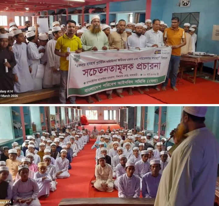 বাংলাদেশ পরিবেশ আইনবিদ সমিতি (বেলা) কর্তৃক একবার ব্যবহার্য্য প্লাস্টিক পলিথিন বর্জন এবং বিকল্প ব্যবহারের উদ্বুদ্ধকরণ শীর্ষক প্রচার অভিযান গতকাল ঝালকাঠি হাসনাইনিয়া হাফিজিয়া মাদ্রাসার ছাত্র শিক্ষকদের সমন্বয়ে মাদ্রাসা প্রাঙ্গনে অনুষ্ঠিত হয়। প্রায় দেড় শতাধিক ছাত্র-শিক্ষক এতে অংশগ্রহণ করেন। অনুষ্ঠানে সভাপতিত্ব করেন বেলা'র ঝালকাঠি জেলা নেটওয়ার্ক মেম্বার মু আল আমিন বাকলাই, প্রধান অতিথি হিসেবে উপস্থিত ছিলেন জেলা দুর্নীতি প্রতিরোধ কমিটির সভাপতি ও মাদ্রাসা পরিচালনা কমিটির সম্পাদক নজরুল ইসলাম তালুকদার। মূল প্রবন্ধ উপস্থাপন করেন বেলা'র বরিশাল বিভাগীয় সমন্বয়ক লিংকন বাইন। অনুষ্ঠানের ছাত্র শিক্ষক ছাড়াও সাংবাদিক উজ্জ্বল রহমান, স্বেচ্ছাসেবী সংগঠক রনি হাওলাদার উপস্থিত ছিলেন। লিংকন বাইন এর চমৎকার উপস্থাপনা ও ছবিতে উঠে আসে মাতৃদুগ্ধ, প্রাণীজ মাংস, বৃক্ষের ফলসহ সবকিছুতেই দূষণ ছাড়িয়ে যাচ্ছে মাত্রা অতিরিক্ত। যা শুনে ও ছবিতে দেখে ছাত্র ও উপস্থিতিরা বিস্মিত হন। গবেষণায় দেখা যায় প্রায় ৮০ ভাগ মানুষের রক্তে মাইক্রোপ্লাস্টিকের উপস্থিতি পাওয়া যাচ্ছে, যারা ক্যান্সারের ঝুঁকিতে রয়েছেন। সভাপতি তার বক্তব্যে বলেন একবার ব্যবহার্য্য পলিথিন প্লাস্টিক মাটিতে আমরা ফেলে দেই যা মাটির সাথে মিশে না বরং মাটির জৈব গুণ, ভূ গর্ভস্থ পানি, জলজ পরিবেশ, মাটির স্থিতিস্থাপকতা নষ্ট করে। পৃথিবী সমুদ্র নদী বায়ু প্লাস্টিক ও পলিথিন দূষণে দূষিত। এ গুলি কৃষিজমি, ড্রেন, নদী-নালা ও খাল-বিলে আমরা ভবিষ্যৎ প্রজন্মের জন্য অ-আবাসযোগ্য করে ফেলছি। প্রধান অতিথি তার বক্তব্যে অত্র ক্যাম্পাস প্লাস্টিক ও পলিথিন মুক্ত রাখার ঘোষণা দেন। অনুষ্ঠানটি উদ্বোধন ও সঞ্চালনা করেন অত্র প্রতিষ্ঠানের প্রধান হাফেজ মাওলানা মোঃ ইব্রাহিম।