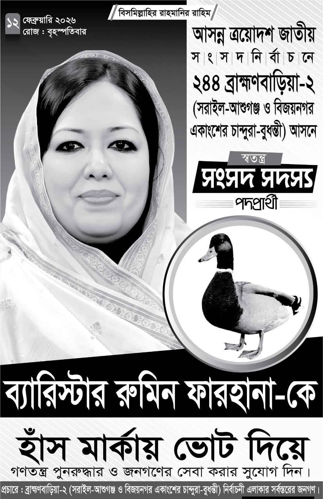 ব্রাহ্মণবাড়িয়া: আসন্ন ত্রয়োদশ জাতীয় সংসদ নির্বাচনে ২৪৪ ব্রাহ্মণবাড়িয়া-২ (সরাইল-আশুগঞ্জ ও বিজয়নগরের চান্দুরা-বুধন্তী একাংশ) আসনের জন্য স্বতন্ত্র সংসদ সদস্য পদপ্রার্থী ব্যারিস্টার রুমিন ফারহানা ভোটারের প্রতি আহ্বান জানিয়েছেন। নির্বাচনী প্রতীক “হাঁস”-এ ভোট দিয়ে তাকে নির্বাচিত করার মাধ্যমে জনগণকে সেবা ও গণতন্ত্র পুনরুদ্ধারের সুযোগ প্রদান করতে অনুরোধ জানানো হয়েছে।