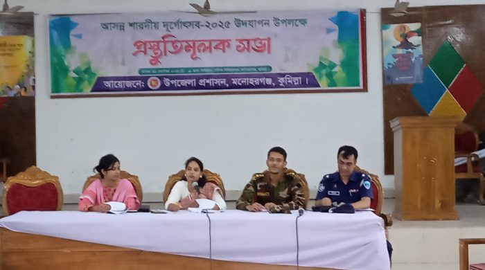 আসন্ন শারদীয় দুর্গা উৎসব উদযাপন উপলক্ষে প্রস্তুতিমূলক সভা অনুষ্ঠিত হয়েছে। রোববার উপজেলা পরিষদ হলরুমে উপজেলা নির্বাহী অফিসার গাজালা পারভীন রুহির সভাপতিত্বে প্রস্তুতিমূলক সভায় বক্তব্য রাখেন সহকারী কমিশনার ভূমি নাসরিন, মনোহরগঞ্জ সেনা ক্যাম্প কমান্ডার ক্যাপ্টেন তাহমিদ,