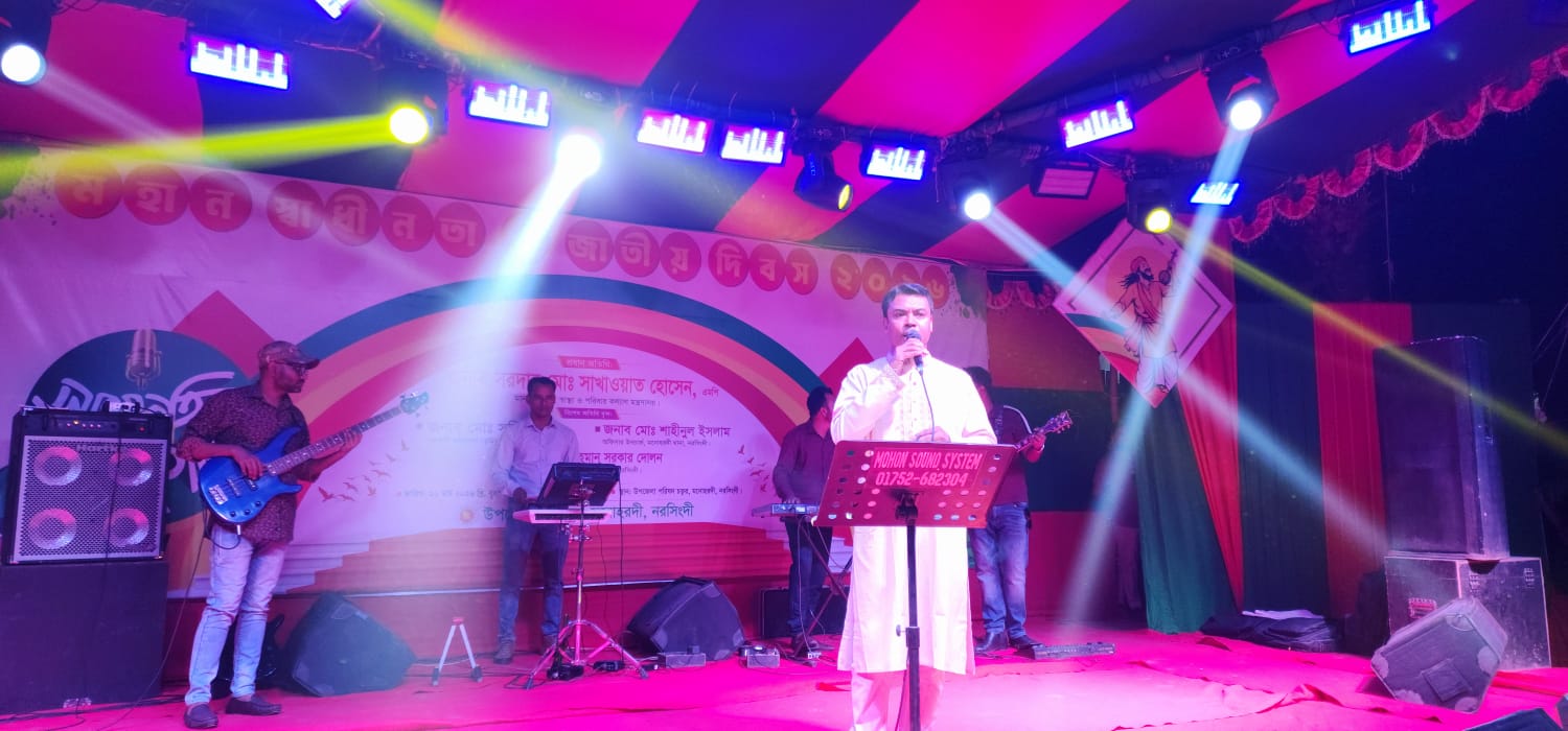 মহান স্বাধীনতা দিবস ও বিজয় দিবস উপলক্ষে নরসিংদীর মনোহরদী উপজেলা চত্বরে আয়োজিত সাংস্কৃতিক সন্ধ্যায় সংগীত পরিবেশন করে দর্শকদের মুগ্ধ করেছেন মনোহরদী থানার অফিসার ইনচার্জ (ওসি) মোঃ শাহিনুল ইসলাম।