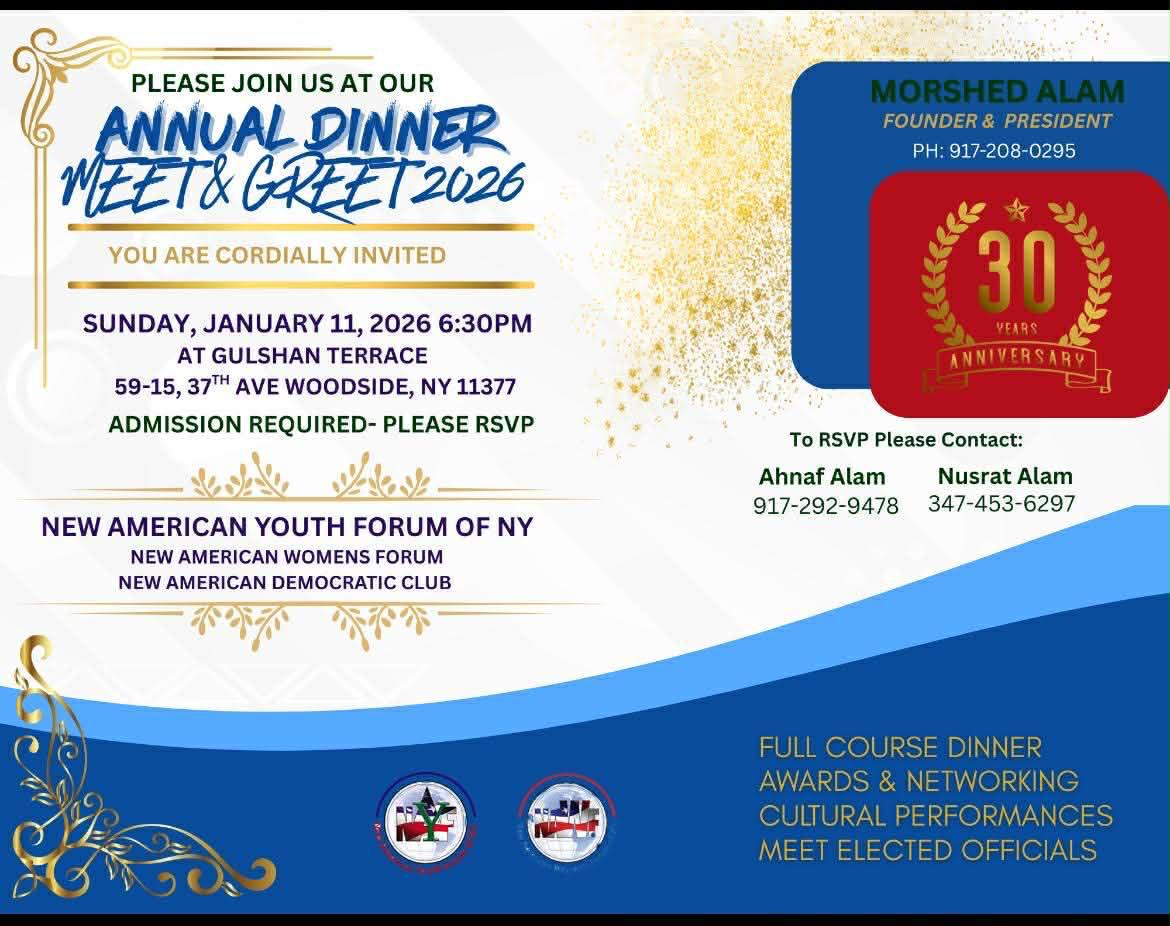 যুক্তরাষ্ট্রের মূলধারার নিউ আমেরিকান জেমোএেটিক অব নিউইয়র্ক ,নিউ আমেরিকান ওমেন্স ফোরাম অব নিউইয়র্ক এবং নিউ আমেরিকান ইউথ ফোরাম অব নিউইয়র্ক যৌথভাবেরবিবার ,১১ জানুয়ারি ২০২৬ নিউইয়র্ক এর ৫৯-১৫,উডসাইড এভিনিউ,নিউইয়র্ক,এনওয়াই-১১৩৭৭ এর নিউইয়র্ক এর গোলশান টেরেসে তিনদশক পূর্তি উদযাপন করবে এবং মিট এন্ড দেয়ার অনুষ্ঠিত হবে ।অনুষ্ঠান শুরু হবে সন্ধ্যা সাড়ে ৬টায় ।
