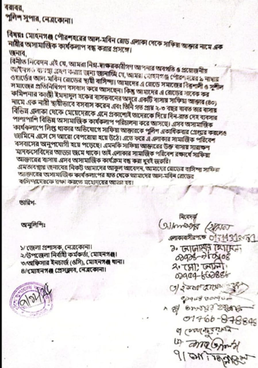 নেত্রকোনার মোহনগঞ্জ পৌর শহরের আল মবিন রোডের একটি বাসায় সাফিয়া আক্তার (৪০) নামে এক নারী কর্তৃক পরিচালিত দেহ ব্যবসা ও অসামাজিক কার্যকলাপ বন্ধের দাবি জানিয়েছেন স্থানীয়রা। গত রবিবার পৌর শহরের ৮০ জন ব্যক্তি সাফিয়ার বিরুদ্ধে নেত্রকোনা পুলিশ সুপারের কাছে লিখিত অভিযোগ করেছেন। যার অনুলিপি জেলা প্রশাসক, সংশ্লিষ্ট থানার ওসি ও উপজেলা নির্বাহী কর্মকর্তার দপ্তরেও পাঠিয়েছেন তারা।অভিযোগ সূত্রে জানা গেছে, সাফিয়া কয়েক বছর ধরে মোহনগঞ্জ পৌর শহরের আল মবিন রোডের একটি বাসায় বসবাস করছেন। তিনি বিভিন্ন জায়গা থেকে নারী এনে তার বাসায় দেহ ব্যবসা করানোর পাশাপাশি রাতদিন অসামাজিক কার্যকলাপ পরিচালনা করেন। এছাড়াও তার বাসায় রাতভর চলে মাদকসেবীদের আড্ডা। ফলে বেড়েছে বখাটে ও মাদকসেবীদের অস্বাভাবিক উৎপাত। এতে এলাকার সামাজিক পরিবেশ বিনষ্ট হচ্ছে। স্থানীয়রা জানিয়েছেন, মোহনগঞ্জ থানার পূর্বপাশে আমেনা নামে আরেক নারীও একইভাবে দীর্ঘদিন ধরেই এমন অসামাজিক কার্যকলাপ চালিয়ে যাচ্ছেন। এ ধরনের অসামাজিক কর্মকান্ডের কারণে শহরের স্থানীয় বাসিন্দারা চরম অস্বস্তিতে পড়েছেন। অভিযুক্ত নারীদেরকে বিগত দিনে পুলিশ গ্রেফতার করলেও পরে তারা জামিনে মুক্ত হয়ে আরও বেপরোয়াভাবে এমন কর্মকান্ড পরিচালনা করছেন। স্থানীয়রা জানিয়েছেন, এমন অসামাজিক কার্যকলাপ বন্ধ করা না গেলে দ্রুত সামাজিক অবক্ষয় দেখা দিবে। তাই তারা পুলিশ ও প্রশাসনের কঠোর হস্তক্ষেপ কামনা করেছেন।মোহনগঞ্জ থানার ওসির দায়িত্বে থাকা পরিদর্শক (তদন্ত) মো. শফিকুজ্জামান এ ব্যাপারে দ্রুত আইনি পদক্ষেপ নেওয়ার আশ্বাস দিয়েছেন।উপজেলা নির্বাহী কর্মকর্তা আমেনা খাতুন বলেন, এ সংক্রান্ত অভিযোগ পেয়েছি। যা নিয়ে পুলিশের সাথে কথা বলে যৌথভাবে প্রয়োজনীয় ব্যবস্থা গ্রহণ করা হবে।জেলা পুলিশের মুখপাত্র অতিরিক্ত পুলিশ সুপার (ডিএসবি) হাফিজুল ইসলাম বলেন, বিষয়টি তদন্ত করে দ্রæত ব্যবস্থা নেওয়ার জন্য সংশ্লিষ্ট থানা পুলিশকে নির্দেশ দেওয়া হবে।জেলা প্রশাসক মো. সাইফুর রহমান বলেন, সংশ্লিষ্ট ইউএনওর সাথে কথা বলে এ বিষয়ে ব্যবস্থা নিতে পুলিশ সুপারকে ব