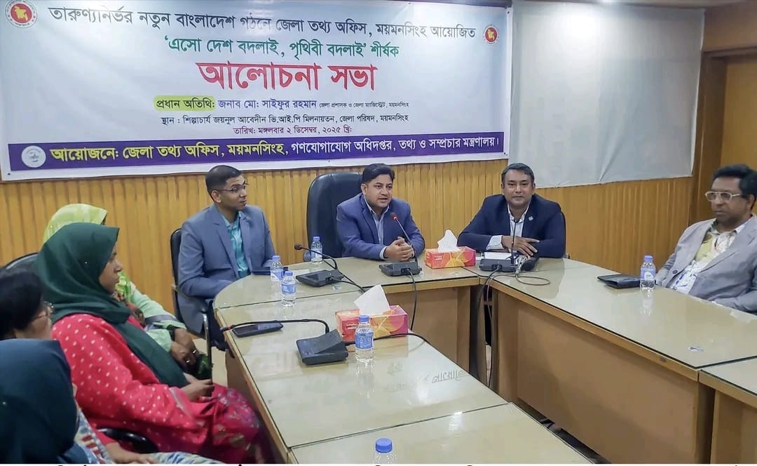 ময়মনসিংহ জেলা তথ্য অফিস, আয়োজনে তারুণ্য নির্ভর নতুন বাংলাদেশ গঠনে 'এসো দেশ বদলাই, পৃথিবী বদলাই' শীর্ষক আলোচনা সভা অনুষ্ঠিত হয়েছে। ময়মনসিংহ জেলা পরিষদের শিল্পাচার্য জয়নুল আবেদীন মিলনায়তনে আজ ০২ ডিসেম্বর মঙ্গলবার বিকেলে এ সভা অনুষ্ঠিত হয়।