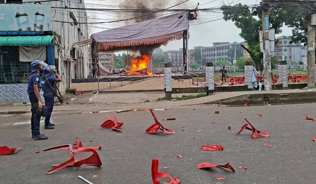 এ সময় সমাবেশস্থলের চেয়ার রাস্তায় এনে আগুন ধরিয়ে দেওয়া হয়। শহরের পৌর পার্ক ও লঞ্চ ঘাট এলাকা রণক্ষেত্রে পরিণত হয়েছে। সেনাবাহিনী ও পুলিশ মোতায়েন থাকলেও শহরের দোকানপাট ও যান চলাচল বন্ধ রয়েছে।