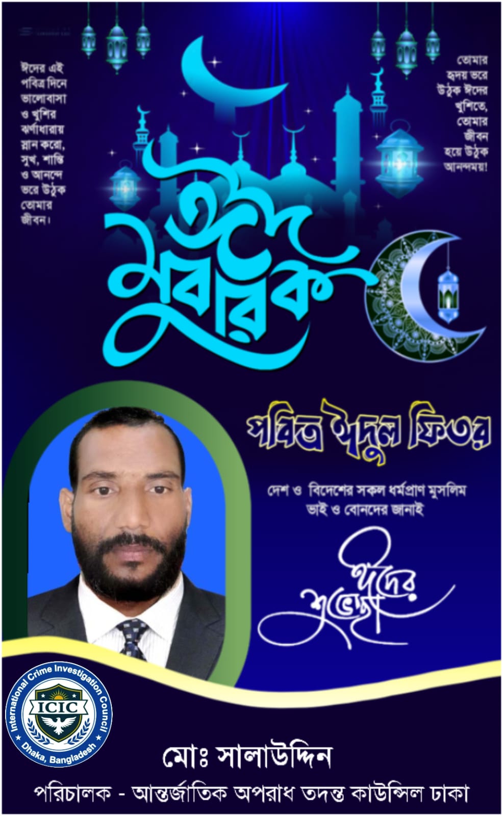 আসসালামু আলাইকুম ওয়া রাহমাতুল্লাহ প্রিয় দেশবাসী ক্রাইম ইনভেস্টিগেশন কাউন্সিলর অর্গানিজেশন এর পক্ষ থেকে সকলকে পবিত্র ঈদুল ফিতরের শুভেচ্ছা সকলের জীবনে বয়ে আনুক সুখ সমৃদ্ধি আর আনন্দময় জীবন সকলের প্রতি আমার পক্ষ থেকে শুভকামনা রইল ঈদ মোবারক