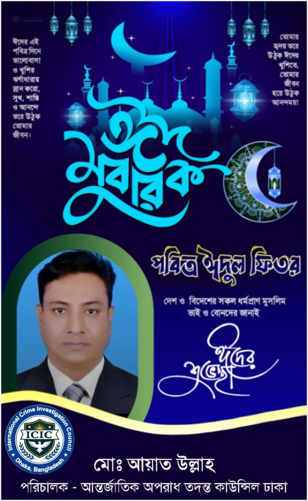 শান্তি নিরাপত্তা কামনা করে দেশবাসীকে পবিত্র ঈদুল ফিতরের শুভেচ্ছা ও অভিনন্দন জানিয়েছে, বিশিষ্ট সমাজ সেবক শিক্ষা অনুরাগী সিনিয়র সাংবাদিক নেতা জনাব মোঃ আয়াতউল্লাহ উপ সম্পাদক দৈনিক বাংলার সংবাদ ও পরিচালক ইন্টারন্যাশনাল ক্রাইম ইনভেস্টিগেটর কাউন্সিল।