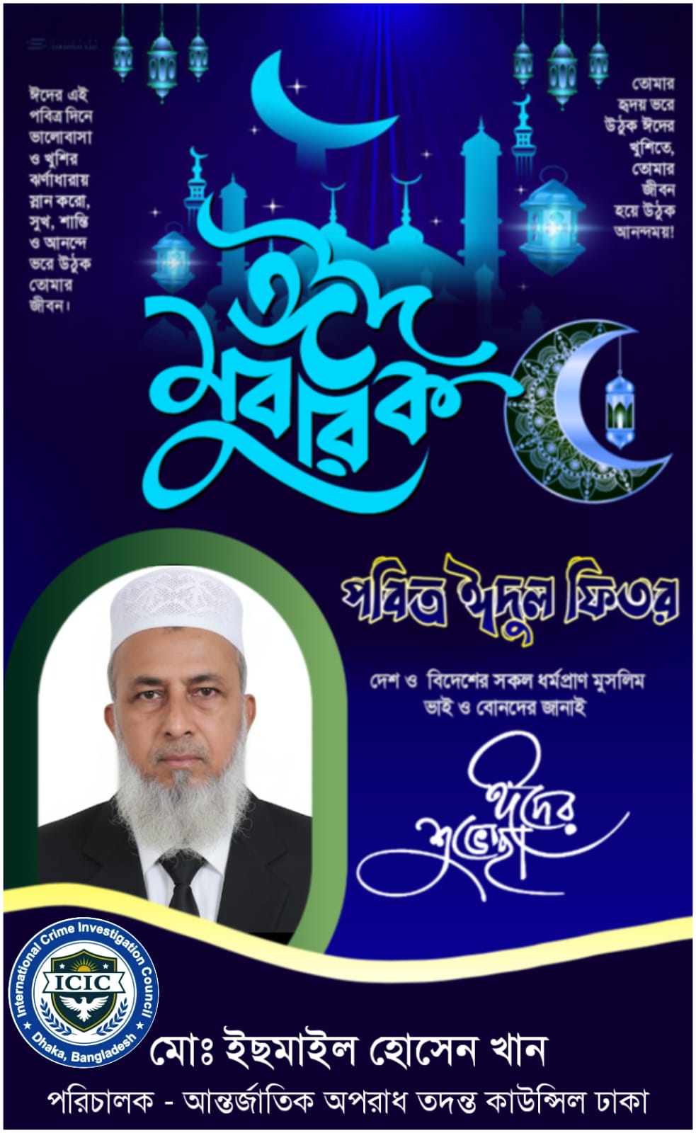 আসসালামু আলাইকুম ওয়া রাহমাতুল্লাহ প্রিয় দেশবাসী ক্রাইম ইনভেস্টিগেশন কাউন্সিলর অর্গানিজেশন এর পক্ষ থেকে সকলকে পবিত্র ঈদুল ফিতরের শুভেচ্ছা সকলের জীবনে বয়ে আনুক সুখ সমৃদ্ধি আর আনন্দময় জীবন সকলের প্রতি আমার পক্ষ থেকে শুভকামনা রইল ঈদ মোবারক