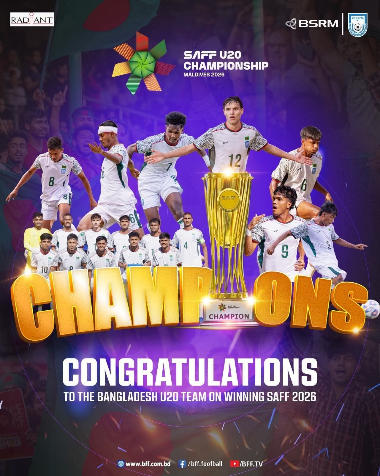 সাফজয়ী বাংলাদেশ অনূর্ধ্ব-২০ ফুটবল দলকে অভিনন্দন জানিয়েছেন মাননীয় প্রধানমন্ত্রী তারেক রহমান