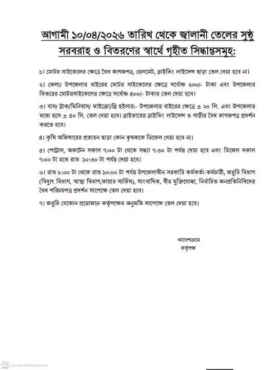 ১০ এপ্রিল থেকে কার্যকর নতুন নির্দেশনা – জ্বালানি তেল সরবরাহে কড়াকড়ি: