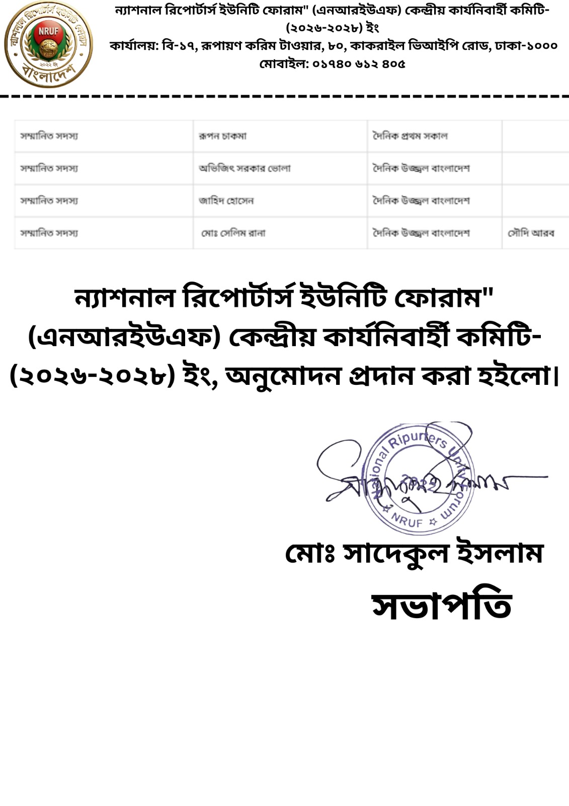 ন্যাশনাল রিপোর্টার্স ইউনিটি ফোরাম (এনআরইউএফ) এর কেন্দ্রীয় কার্যনির্বাহী কমিটি (২০২৬–২০২৮) আনুষ্ঠানিকভাবে অনুমোদন দেওয়া হয়েছে। দেশের নির্যাতিত ও নিপীড়িত সাংবাদিক, পুলিশ এবং সাধারণ জনগণের পক্ষে বলিষ্ঠ কণ্ঠস্বর হিসেবে কাজ করার লক্ষ্যে এই কমিটি গঠন করা হয়েছে।