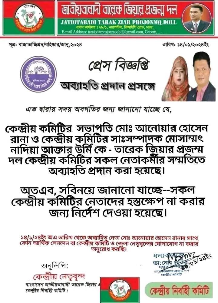 তারেক জিয়ার প্রজন্ম দলের কেন্দ্রীয় কমিটির সভাপতি আনোয়ার হোসেন রানা এবং সাধারণ সম্পাদক আনোয়ার হোসেন রানার স্ত্রী নাদিরা আক্তার উর্মি দীর্ঘ দিন যাবৎ তারেক জিয়ার প্রজন্ম দলের কেন্দ্রীয় কমিটির সভাপতি পরিচয় দিয়ে বিভিন্ন জেলা টাকার বিনিময়ে কমিটি দিয়ে টাকার বানিজ্য করছে। এবং যত গুলো কমিটি দিয়েছে শুধু স্বৈরাচারী আওয়ামী লীগের কর্মীদের কমিটি দিয়ে টাকার বানিজ্য করছে এটা প্রমানিত হয়েছে। উক্ত আনোয়ার হোসেন রানার সভাপতি এবং তার স্ত্রী নাদিরা আক্তার উর্মি সাধারণ সম্পাদক এছাড়া রানার কমিটি তে আর কোন পদ পদবী এবং সংগঠনের গনতন্ত্র নেই।। এটাই তদন্ত করে প্রতিয়মান হয় যে, দেশের একটি বৃহৎ রাজনৈতিক দল বিএনপি। আর বিএনপির প্রধান মন্ত্রীর নাম সংগঠনের নাম ব্যবহার করে দুর্নীতি, অনিয়ম, দলের নির্দেশ অমান্য করে আওয়ামী লীগের কর্মীদের টাকার বিনিময়ে কমিটি দিয়ে আসছে।। প্রকৃত পক্ষে আনোয়ার হোসেন রানা বিএনপির দলের কেউ নয়,সে একজন আওয়ামী লীগের দোসর এবং প্রতারক,বাটপার,, তার প্রমান, যখন সংগঠনের নেতা-কর্মীরা সবার সম্মতিতে প্রতারক আনোয়ার হোসেন রানা এবং তার স্ত্রী নাদিরা আক্তার উর্মি সাধারণ সম্পাদক কে অব্যাহতির আদেশ দিলে উক্ত আনোয়ার হোসেন রানা পরবর্তী তে,,, জাতীয় সমাজ পার্টি বাংলাদেশ আরেক সংগঠন তৈরি করে বিভিন্ন জেলা কমিটি দিয়ে টাকার বানিজ্য করাই বাটপার আনোয়ার হোসেন রানার একমাত্র পেশা।