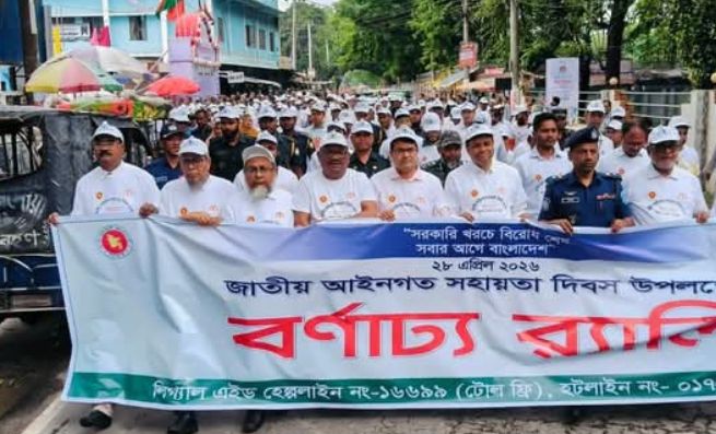 সরকারি খরচে বিরোধ শেষ, সবার আগে বাংলাদেশ’-এই প্রতিপাদ্যকে সামনে রেখে লালমনিরহাটে জাতীয় আইনগত সহায়তা দিবস ২০২৬ পালিত হয়েছে। দিবসটি উপলক্ষে আজ মঙ্গলবার (২৮ এপ্রিল) সকালে জেলা জজ আদালত প্রাঙ্গণ থেকে একটি বর্ণাঢ্য শোভাযাত্রা বের করা হয়। শোভাযাত্রাটি শহরের প্রধান প্রধান সড়ক প্রদক্ষিণ শেষে পুনরায় আদালত চত্বরে গিয়ে শেষ হয়।