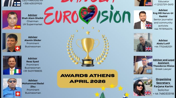 প্রতিষ্ঠাতা ও প্রেসিডেন্ট ডাকুয়া জহিরের নেতৃত্বে বিশাল আন্তর্জাতিক অ্যাওয়ার্ড – ২০২৬ আয়োজন গ্রিসের এথেন্সে আগামী ১২, ১৩ ও ১৪ জুন ২০২৬ তারিখে অনুষ্ঠিত হতে যাচ্ছে বহুল প্রতীক্ষিত বাংলা ইউরোভিশন কমিউনিটি